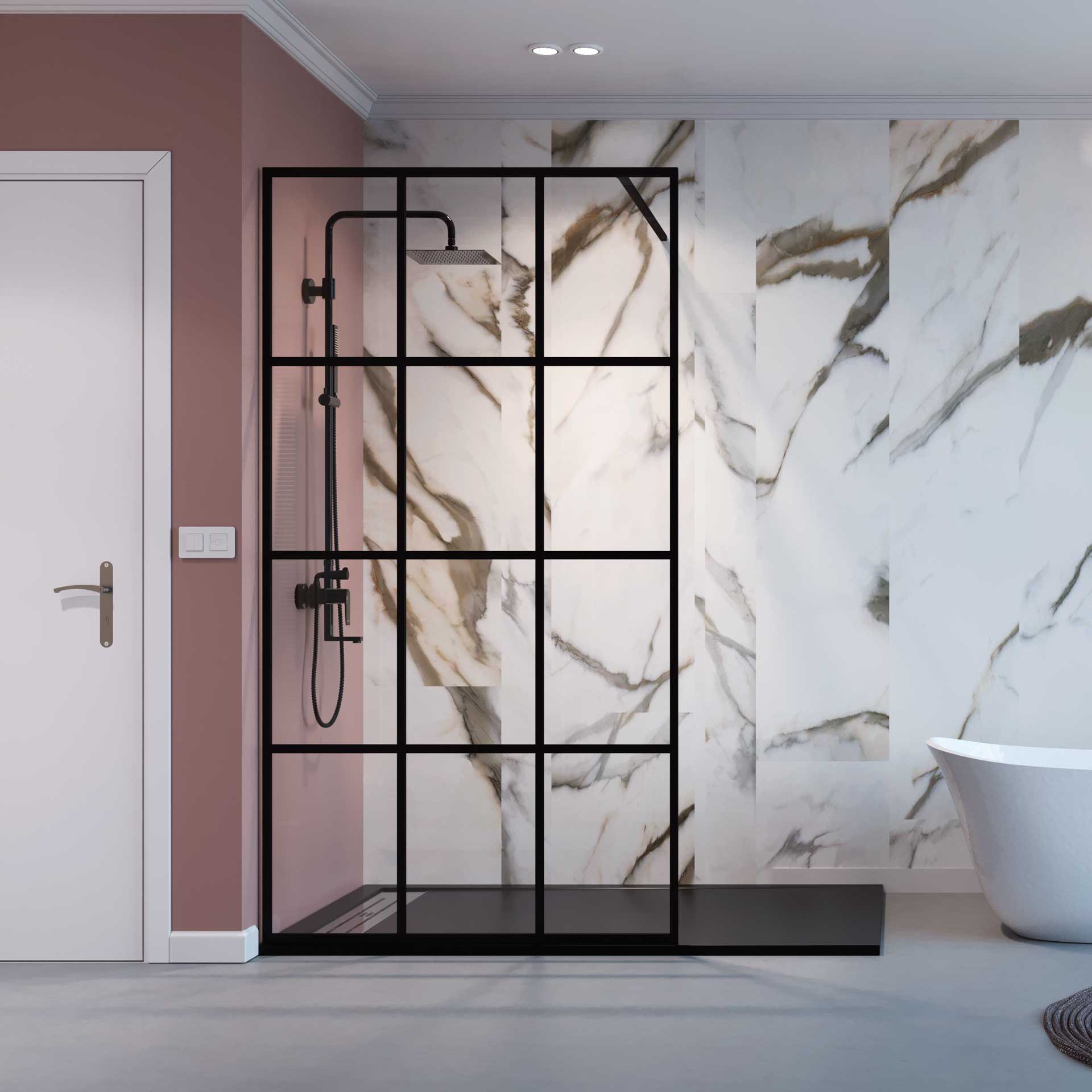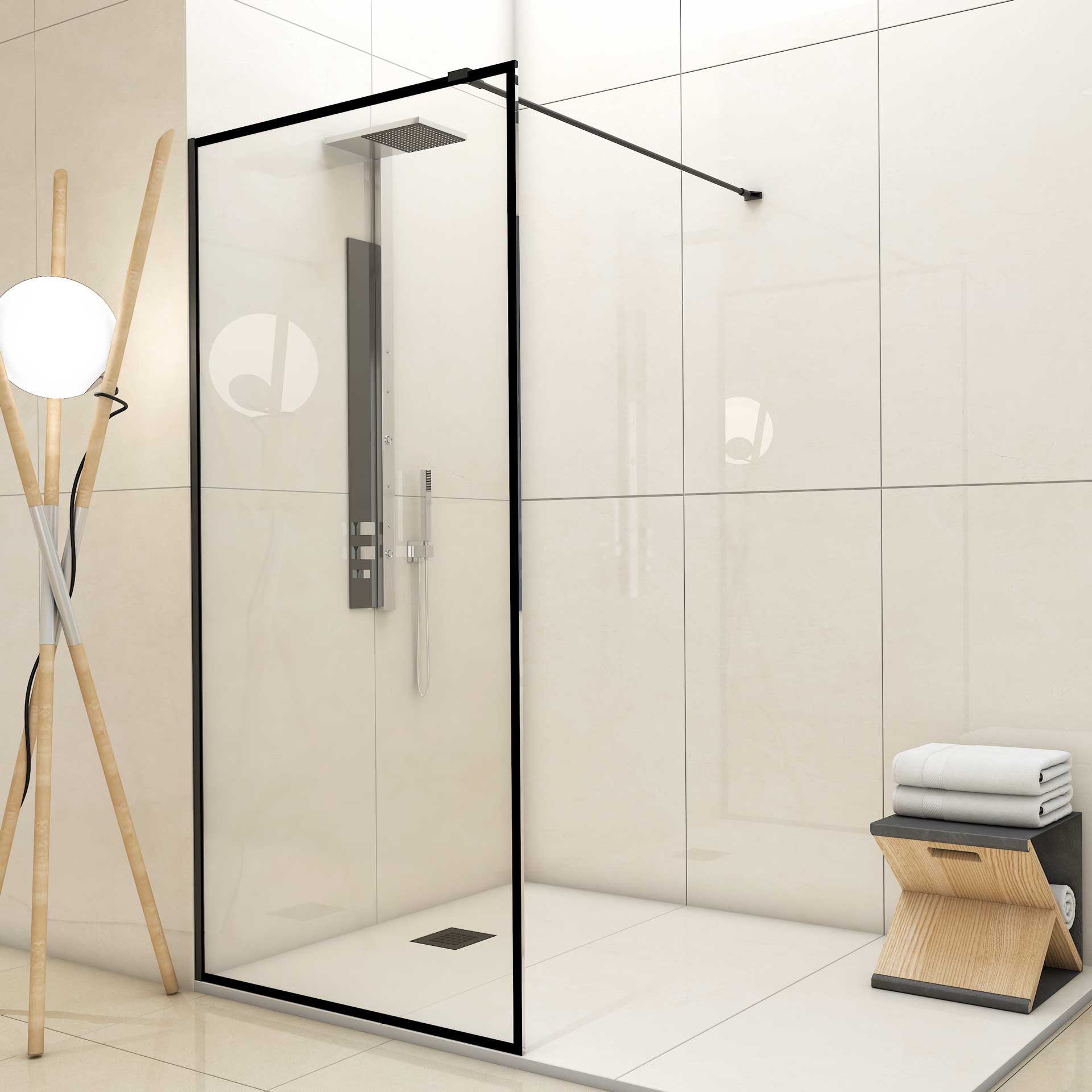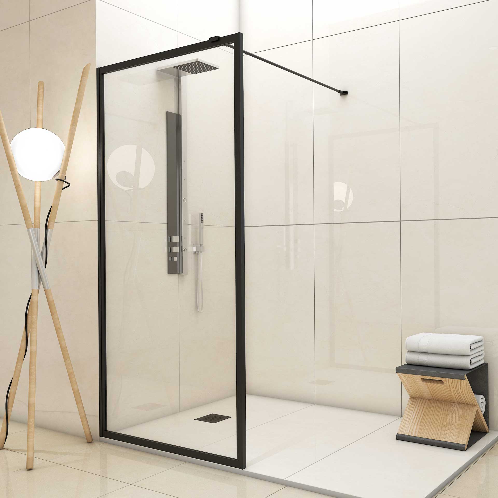 DUCHA 1 HOJA FIJA 3 CUARTERONES NEGROS VERTICALES SERIGRAFIADOS